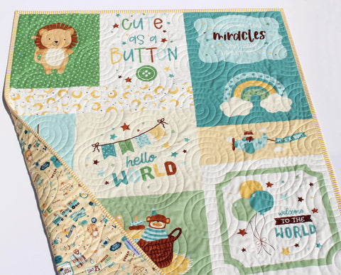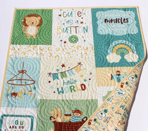 Welcome your little one with this personalized baby boy quilt, featuring a sweet modern patchwork design filled with playful animals, soft pastels, and charming “Welcome Baby” details. This handmade nursery quilt is perfect for crib display, tummy time, or as a meaningful baby shower gift. Crafted with high-quality cotton fabrics and professional quilting, it’s designed to be both beautiful and functional—an heirloom keepsake your family will treasure for years. It measures approximately 34" by 42" perfect for that special little boy. The backing is a fun coordinating print with adorable baby items on a blue background.