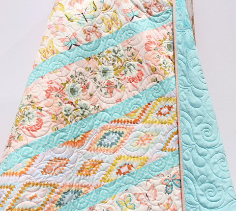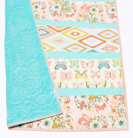 Ready to ship! This quilt was made with a mix of designer prints. This adorable quilt includes coral pink, aqua blue, white, teal, and gold. It measures approximately 37" by 47". The quilting really adds to the beauty of this quilt! Such a fun, unique, and stunning looking quilt your little one will be able to grow with it for many years to come!