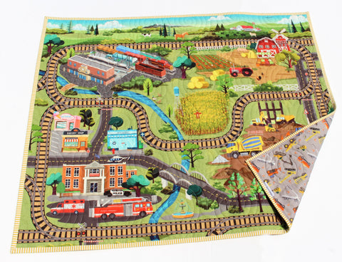 Introduce hours of imaginative play and cozy comfort with our “Let’s Go Play Mat Quilt.” This charming children’s quilt features a vibrant train and roadway-panel print with cars and trucks, finished with quality binding and soft backing — it’s ready to ship from our studio in Texas and arrives as a fun, durable blanket perfect for a playroom, toddler’s room, or as a unique baby-shower gift. Made with 100% cotton fabric and quilt batting, CANVAS top, it’s durable, cozy, and machine washable — perfect for everyday play. The quilt measures 35" x 42", making it the ideal floor mat for toddlers, tummy-time for babies, or a portable travel blanket.